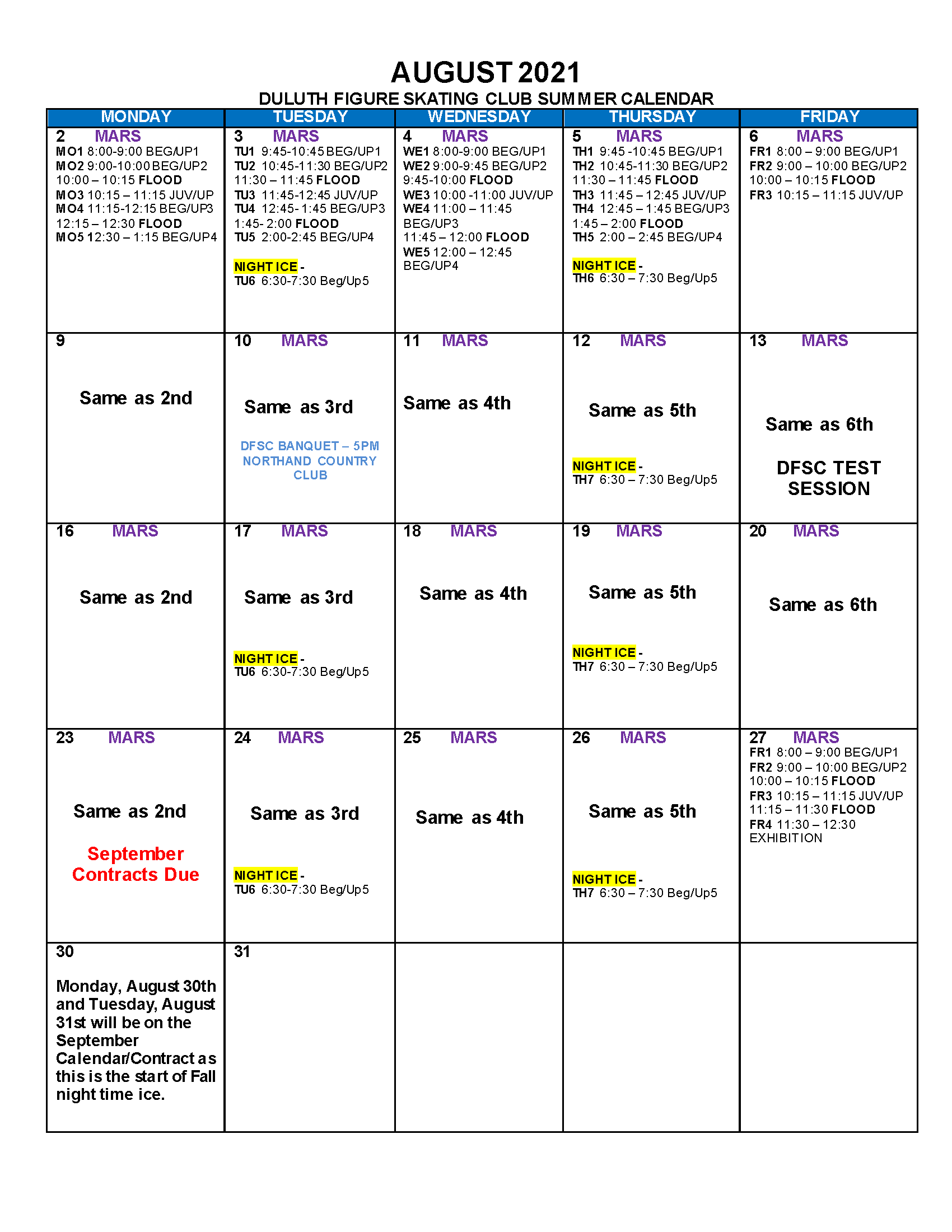 August 2021 Contracting Calendar for Duluth FSC Club Members