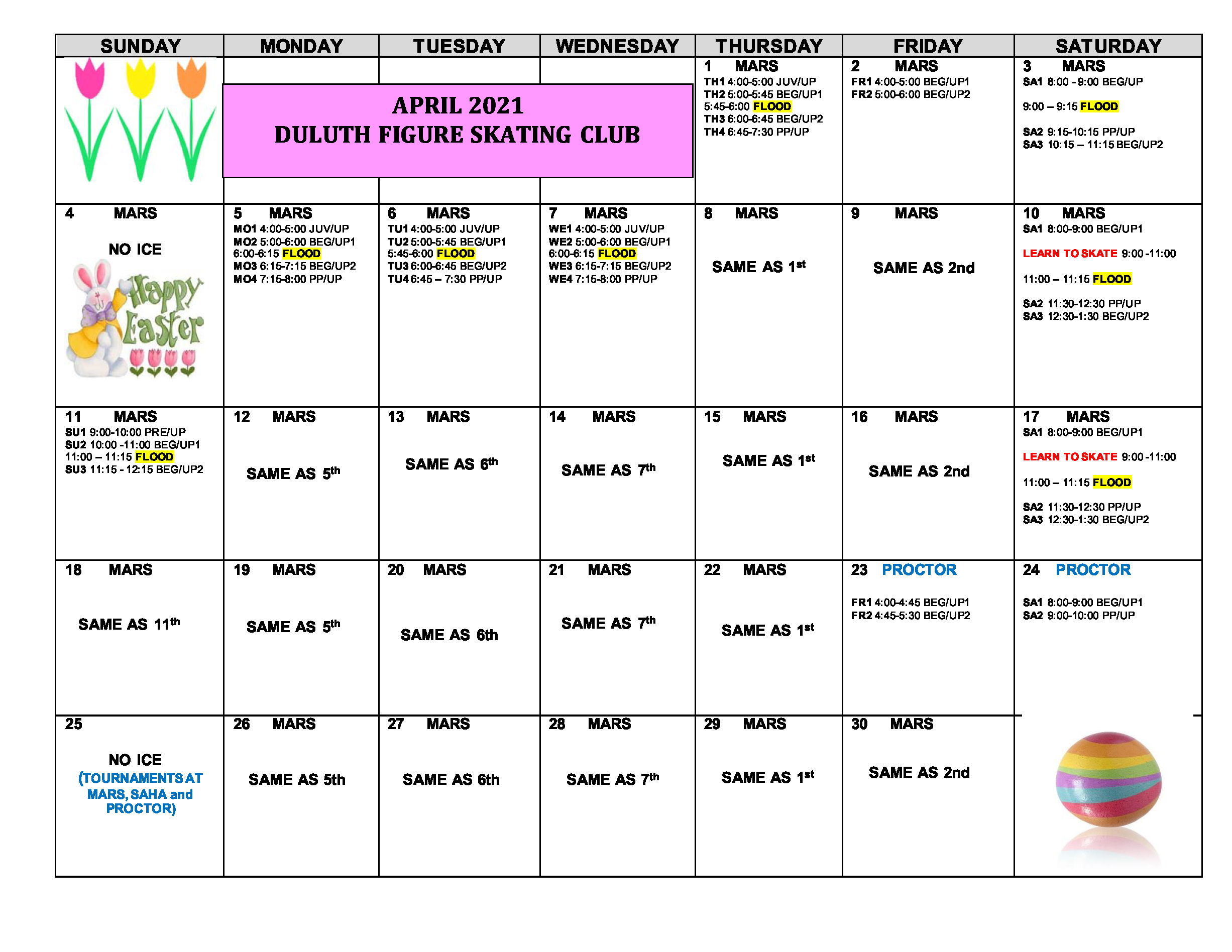Session Calendar for contracting club members of the Duluth FSC. Skaters have the option to choose sessions in which to contract for, Sunday-Saturday on a variety of sessions