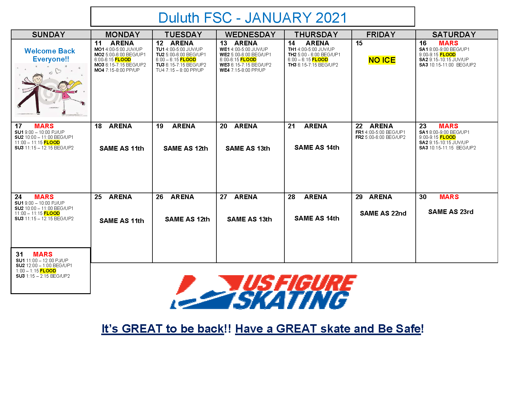 Session Calendar for contracting club members of the Duluth FSC. Skaters have the option to choose sessions in which to contract for, Sunday-Saturday on a variety of sessions