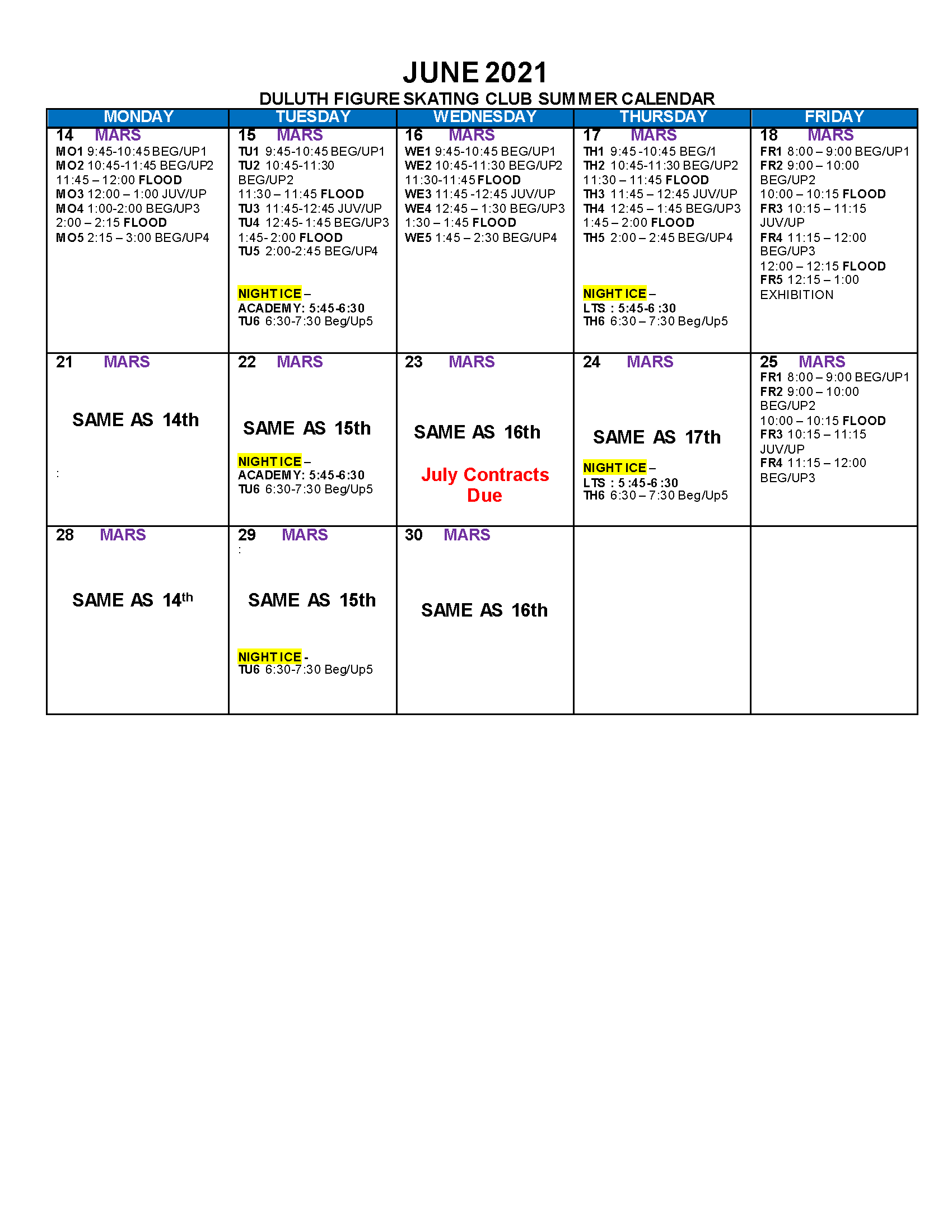 June 2021 Contracting Calendar for Duluth FSC Club Members