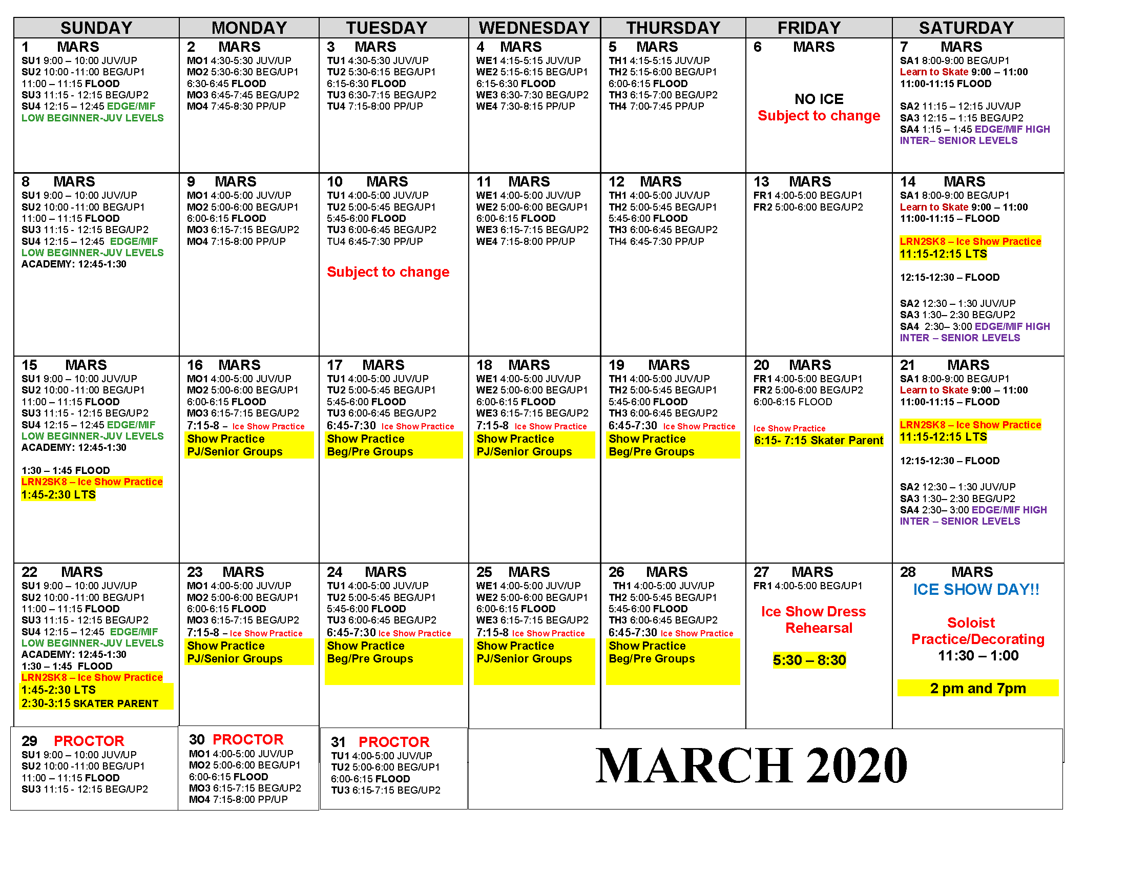 Session Calendar for contracting club members of the Duluth FSC. Skaters have the option to choose sessions in which to contract for, Sunday-Saturday on a variety of sessions.