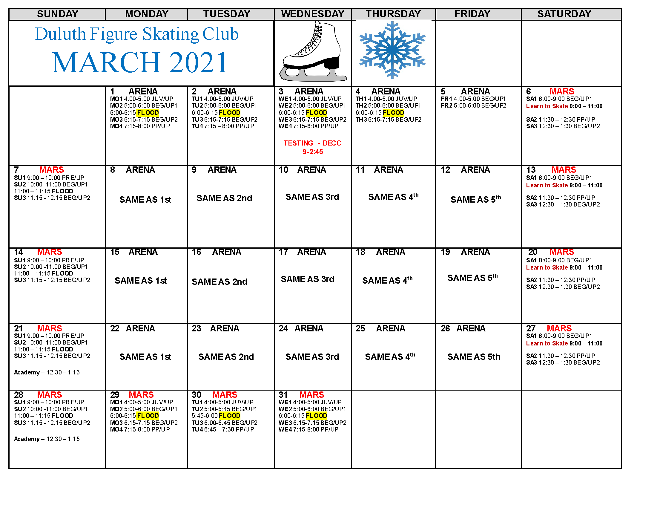 Session Calendar for contracting club members of the Duluth FSC. Skaters have the option to choose sessions in which to contract for, Sunday-Saturday on a variety of sessions
