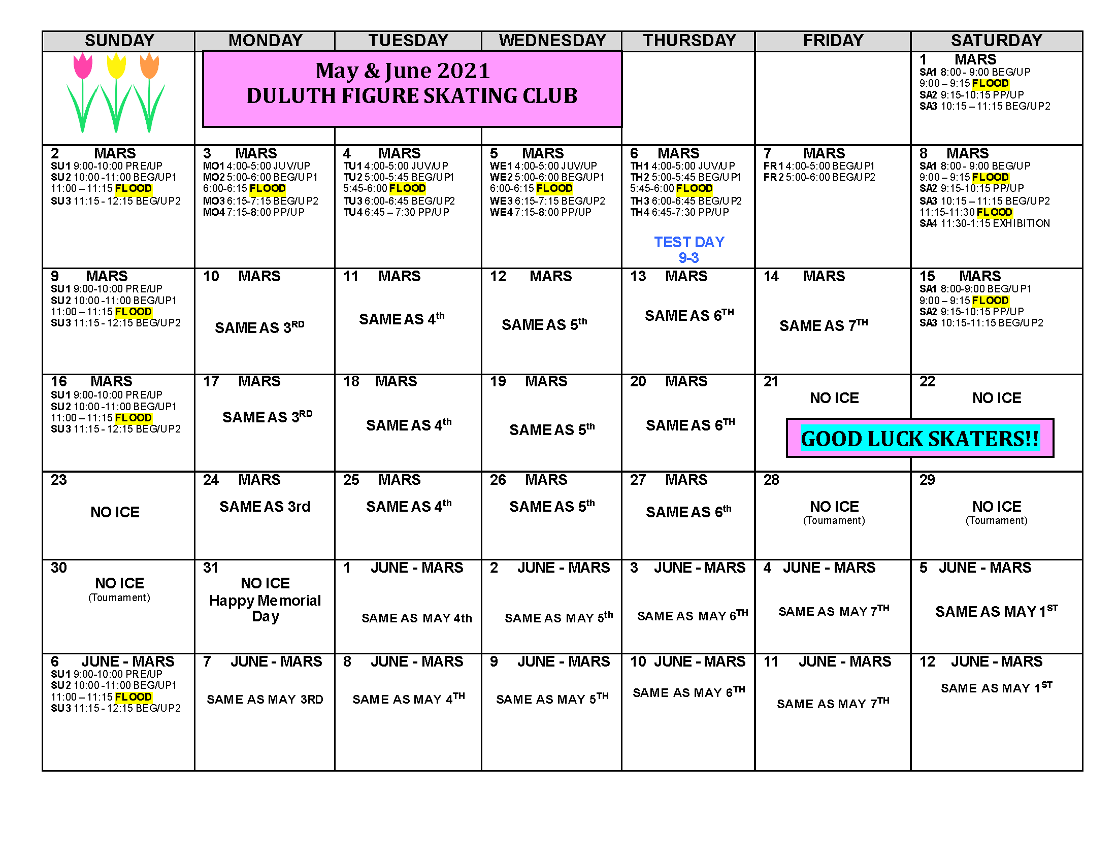 Session Calendar for contracting club members of the Duluth FSC. Skaters have the option to choose sessions in which to contract for, Sunday-Saturday on a variety of sessions