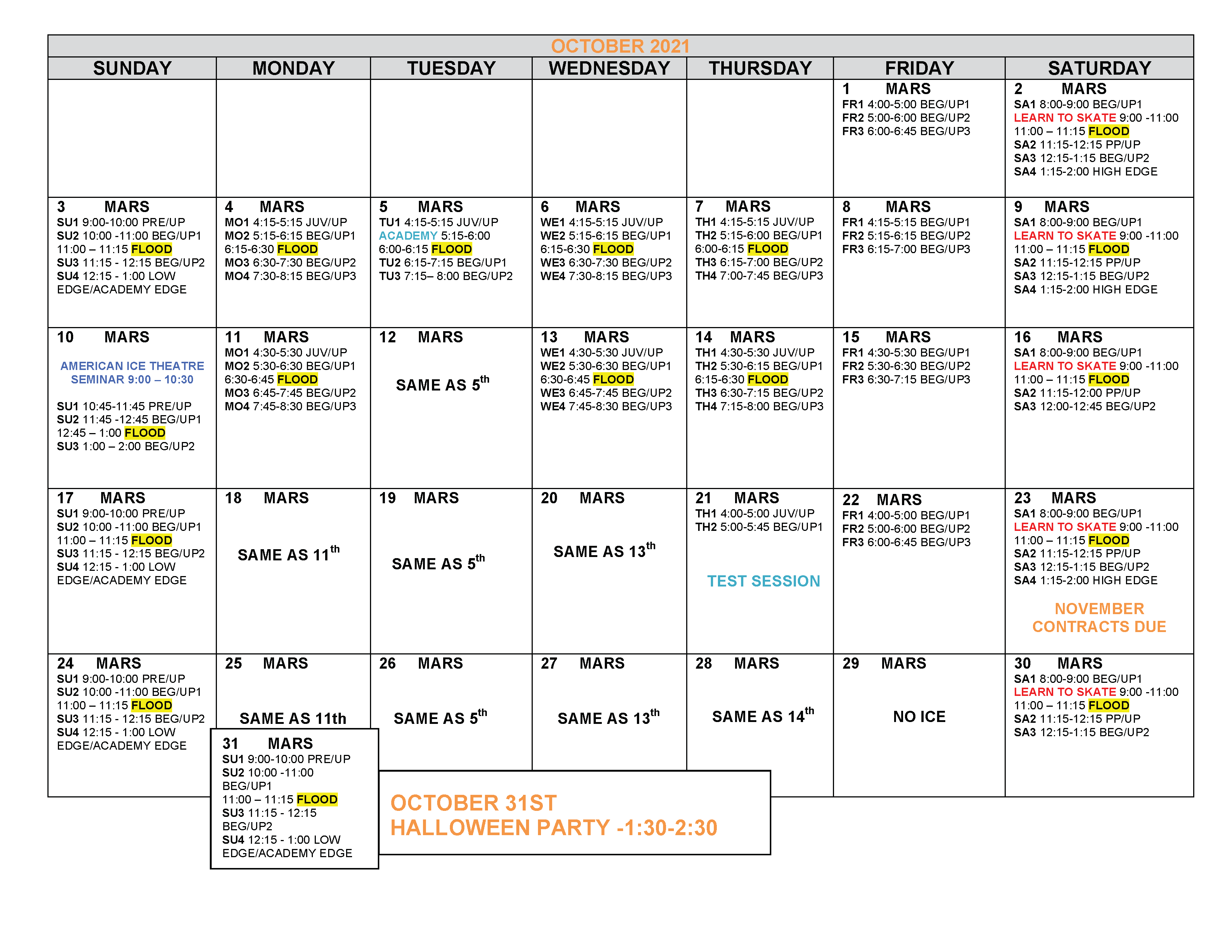 Session Calendar for contracting club members of the Duluth FSC. Skaters have the option to choose sessions in which to contract for, Sunday-Saturday on a variety of sessions