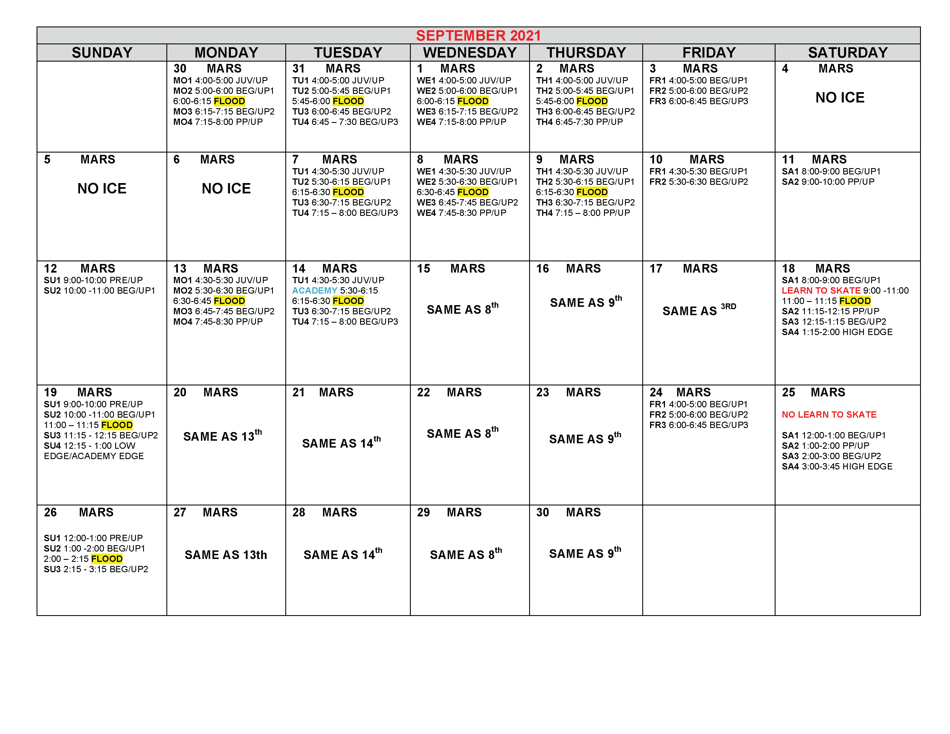 Session Calendar for contracting club members of the Duluth FSC. Skaters have the option to choose sessions in which to contract for, Sunday-Saturday on a variety of sessions